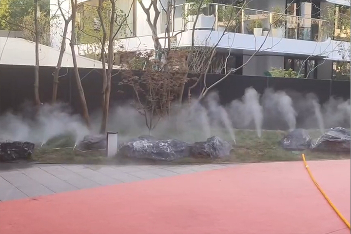 安裝室外噴霧造景設(shè)備,共計180個噴頭。為夏天的炎熱送去一絲涼意。